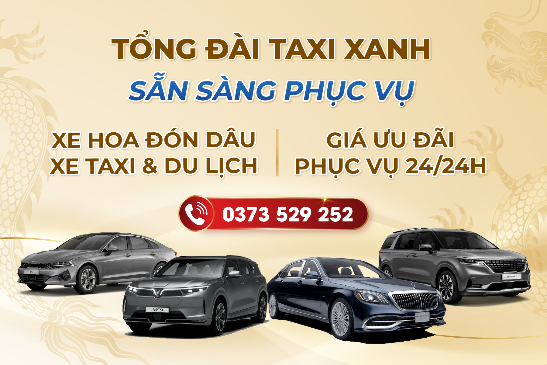Dịch vụ taxi với hệ thống đặt xe trực tuyến giá rẻ nhất thị trường, đưa đón sân bay toàn cuốc, taxi giá rẻ, thuê xe đi du lịch, thuê xe đi công tác, thuê xe về quê có tài xế, các loại xe văn phòng ( xe không tem mào) đời mới, phong cách lịch sự, sẵn sàng phục vụ đưa đón quý khách mọi lúc mọi nơi. Hệ thống tổng đài hiện đại với phần mềm quản lý tiên tiến phủ toàn cuốc. Chúng tôi tự hào là một thương hiệu xe taxi giúp bạn di chuyển nhanh chóng và tiện lợi nhất